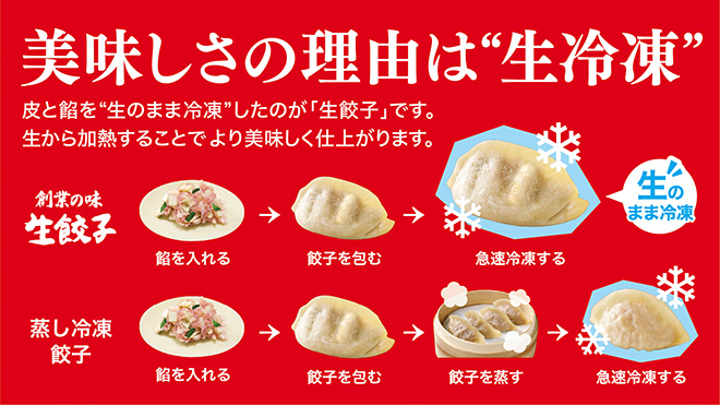 一方、加熱されていない「冷凍生餃子」であれば、野菜やお肉のジューシーな食感や香り、甘みなどの風味がそのままに、瞬間冷凍されて閉じ込められています。だから餃子本来のおいしさを楽しむことができるのです。
