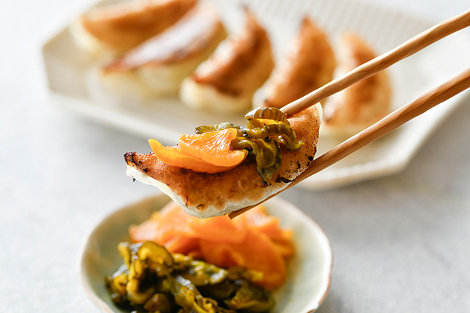 餃子という料理は、発酵食品との相性が良いといわれています。中でも漬物は、程よい酸味と塩味が餃子の旨みを引き立てて、餃子をより一層おいしくしてくれます。また、熱い餃子と冷たい漬物を交互に食べることで、食欲が刺激されて、いつもよりたくさん餃子を食べられちゃいます。キムチでも同じような効果があります。