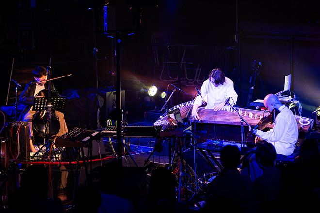 ライブ後半の様子。左から、大井一彌(Dr)、LEO(箏)、網守将平(Synth)ⒸRyuya Amao