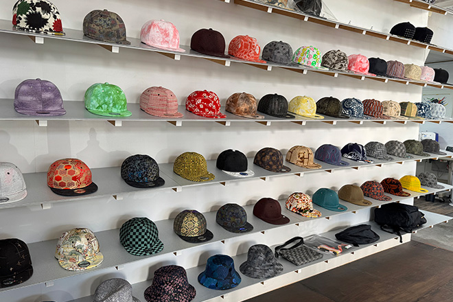 旧郵便局の執務室だったW@nder Fabricの店内。伝統織物で制作したカラフルな帽子が並ぶ