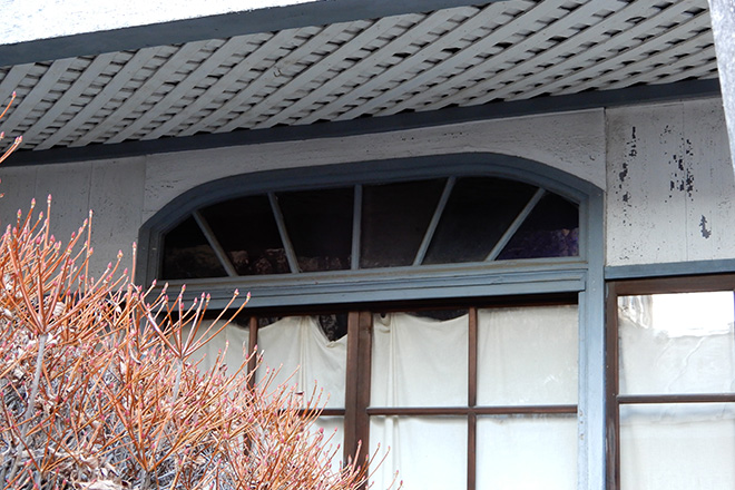 外からは分かりにくいが、窓の上部には青・赤・黃・緑の色ガラスがはめ込まれている。バルコニーの軒裏天井はコロニアル調の格子天井になっている