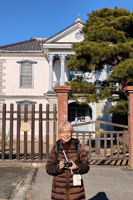 旧本庄警察署前に立つドボたん三上。門の外からでも建物の様子がよく見える