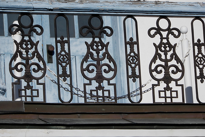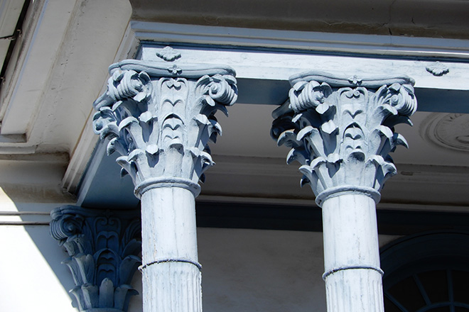 2階ベランダにはアカンサスの葉の柱頭飾りが付けられている。左右2本ずつ並ぶ列柱は石ではなく木製