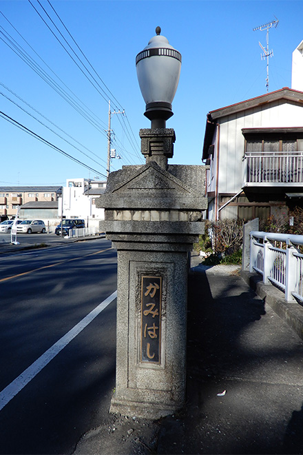警察署から伊勢崎新道をさらに北へ。3〜4分歩いたところで、前方に橋の親柱が見えてきました。くんくん、ふむ。このレトロな匂いは、賀美橋に違いありません。いそいそと近寄ると、ビンゴ! 家の形をした親柱の上には、復元されたアール・デコ調のガラスの橋灯が付いています。欄干の下部には小さなアーチが連続していて、白いタイルで縁取られているのもモダンです。